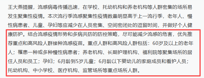 中国疾控中心明确建议,慢性病患者等高危人群应优先接种,整个高发季补种都来得及,且每年都需接种以应对毒株变化。