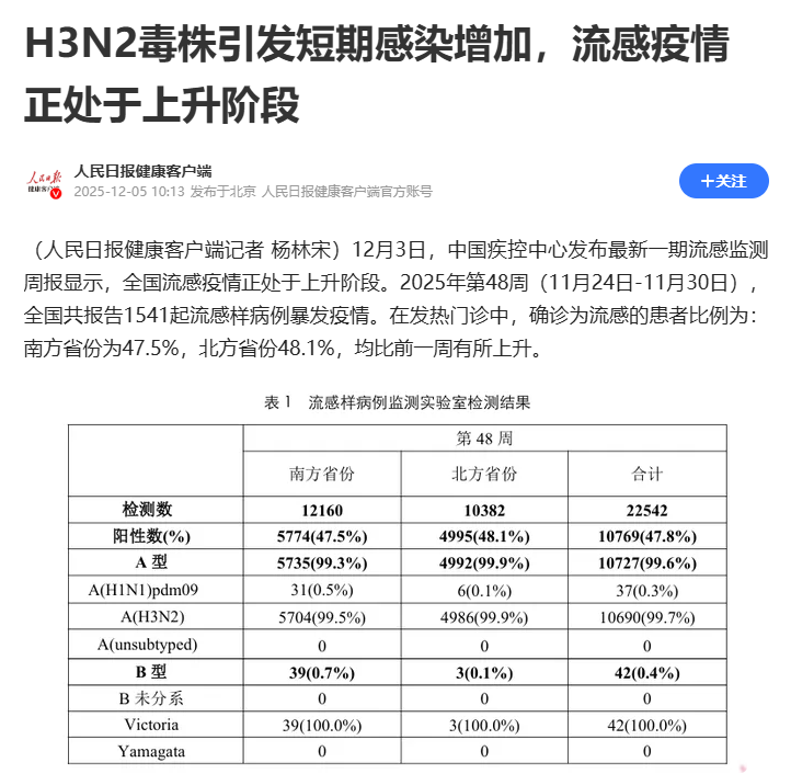 中国疾控中心最新监测周报(2025年第48周)及国家流感中心主任王大燕的公开解读显示,当前流感阳性结果中,甲型H3N2流感毒株占比超95%,成为绝对主流。