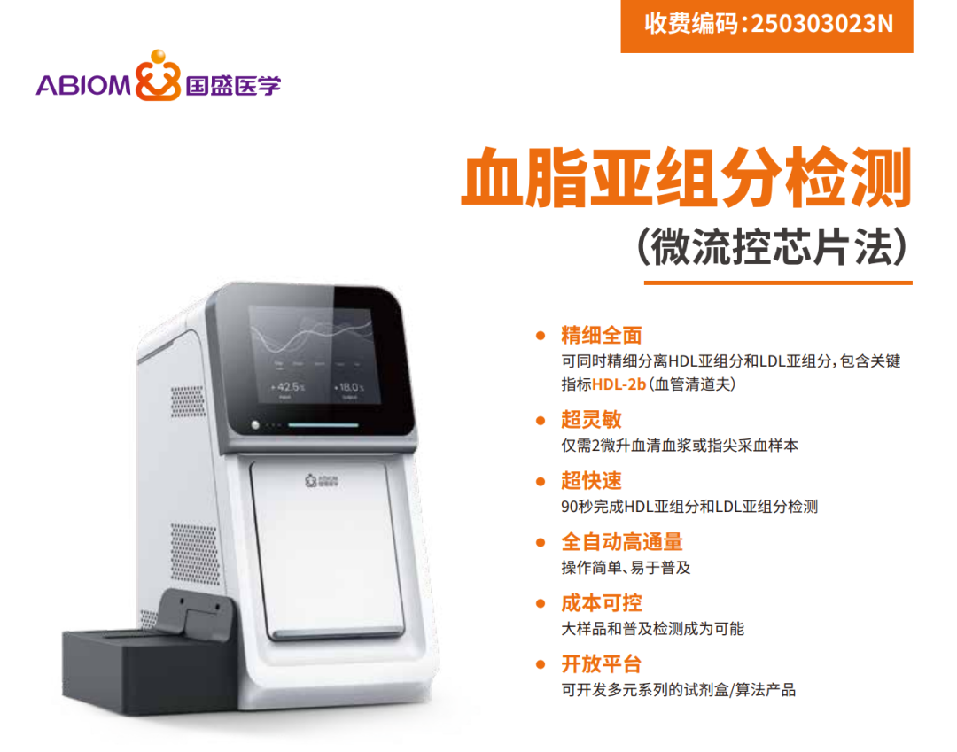 国盛医学推出的血脂亚组分检测系统(微流控芯片法),仅需2微升血清即可实现高密度脂蛋白亚组分及低密度脂蛋白亚组分的高精度检测,包含对血管健康起保护作用的关键指标HDL-2b(血管清道夫)。在流感季更有针对性地调整防护策略,为心脑血管筑牢健康防线。