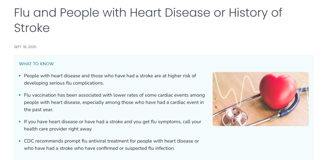 美国疾控中心(CDC)在《Flu and People with Heart Disease or History of Stroke》中指出:流感高发季,心脑血管病患者的住院风险会增加50%以上。